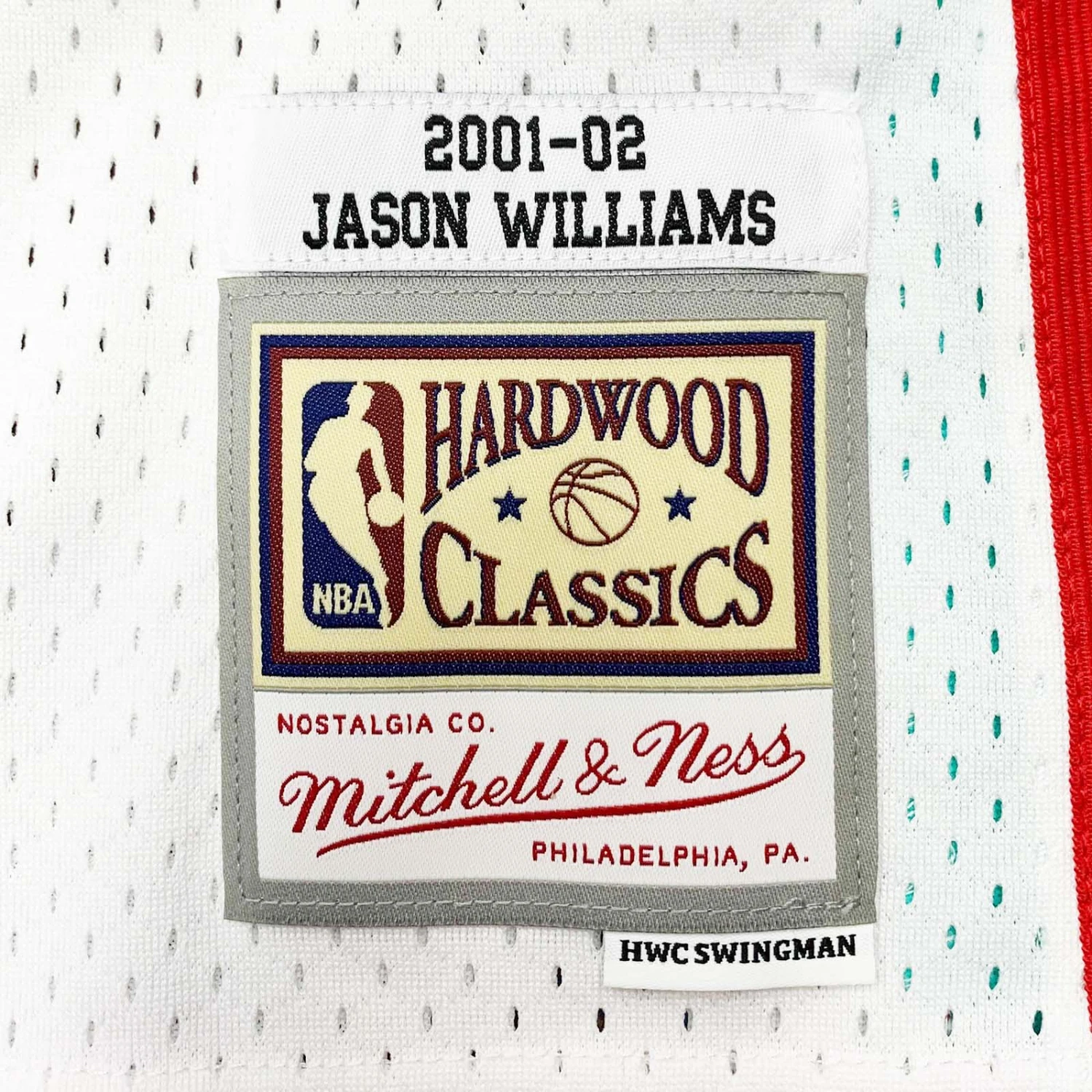 - Mitchell & Ness HWC Swingman woven jock tag and woven label 2000-01 JASON WILLIAMS at lower left front.